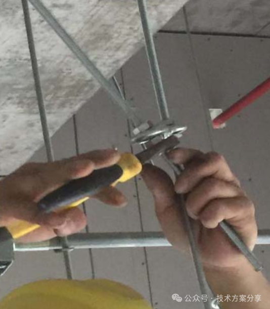 彈線布點(diǎn)、打孔→安裝垂直吊桿→安裝角鐵、L形轉(zhuǎn)接件及斜撐吊桿→安裝吊環(huán)螺栓→安裝主龍骨吊件及主龍骨→調(diào)節(jié)吊環(huán)螺栓角度,校正固定螺母與吊環(huán)螺栓