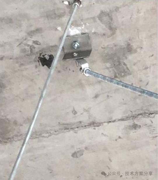 將吊環(huán)螺栓調(diào)節(jié)好角度,用鉗子將螺母與吊環(huán)螺絲緊固,使吊環(huán)螺栓與斜撐吊桿和垂直吊桿三者連接固定,并保證垂直、斜撐吊桿夾角控制在30°~50°,吊環(huán)螺栓上下緊固螺絲確保墊片緊固到位,再將角鐵與L形轉(zhuǎn)接件緊固,保證斜撐吊桿與主吊桿不發(fā)生位移和轉(zhuǎn)動(dòng),如圖所示: