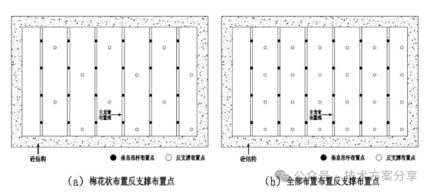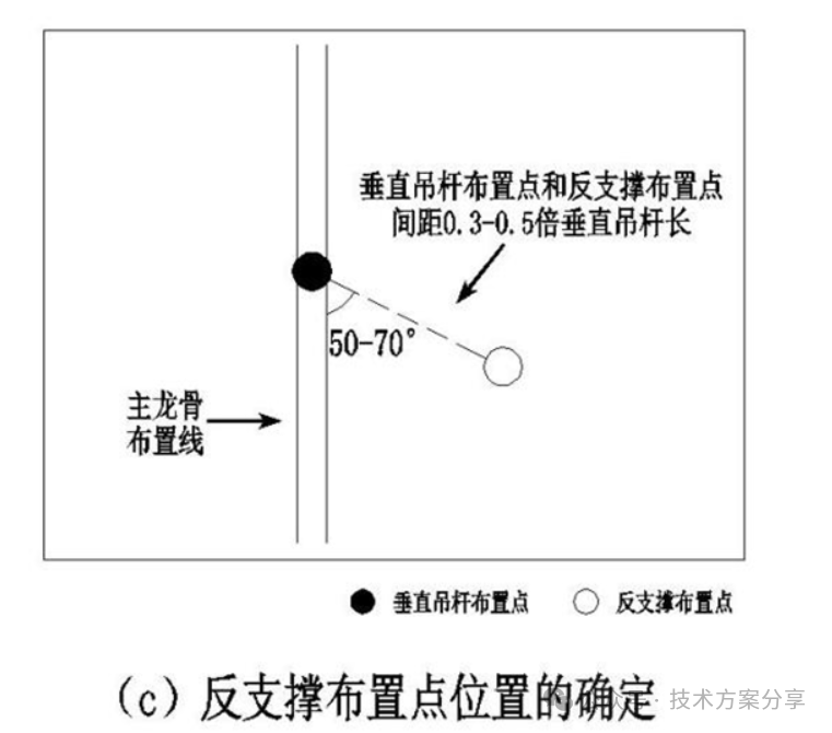 按照吊頂完成圖在頂棚結(jié)構(gòu)面彈出主龍骨布置線,再由主龍骨布置線標(biāo)出垂直吊桿及反支撐布置點(diǎn),梅花狀布置反支撐布置點(diǎn),如圖(a)所示,全部布置反支撐布置點(diǎn),如圖(b)所示,垂直吊桿布置點(diǎn)和反支撐布置點(diǎn)間距0.3-0.5倍的垂直吊桿長(zhǎng),垂直吊桿布置點(diǎn)和反支撐布置點(diǎn)的連線與主龍骨夾角成50-70°,如圖(c)所示。用油漆標(biāo)記清楚,要求橫、豎向在一條直線上。根據(jù)已打好的點(diǎn)位,使用電錘進(jìn)行鉆孔,打孔前按照膨脹螺栓型號(hào)調(diào)整好電錘打孔深度尺,鉆孔不得傾斜、偏位。