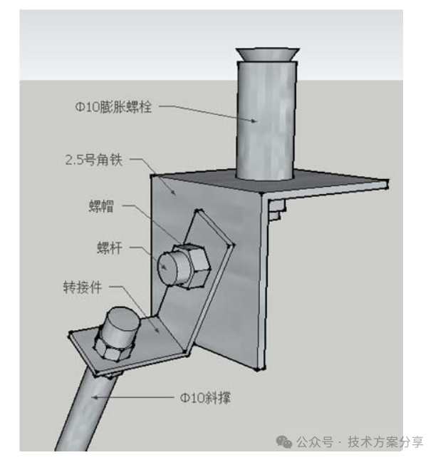 將25mm*25mm角鐵與φ10膨脹螺栓及φ10斜撐吊桿組裝好,斜撐吊桿與L形轉(zhuǎn)接件擰緊,將角鐵和內(nèi)膨脹螺栓相連并將內(nèi)膨脹螺栓埋入已鉆好的孔內(nèi),按照要求將膨脹螺栓螺母擰緊,確保脹管已經(jīng)脹開(kāi),角鐵與L形轉(zhuǎn)接件暫不緊固,如圖所示: