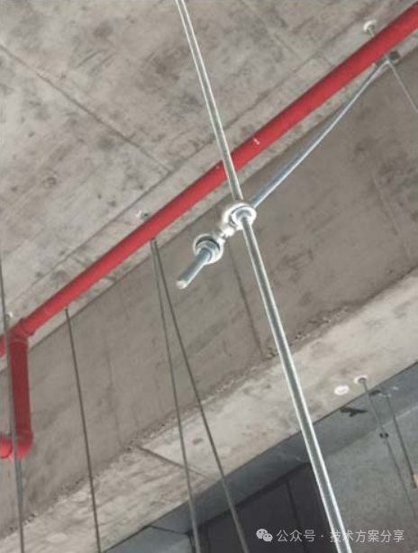 吊桿式吊頂反支撐,采用可工廠量產(chǎn)的吊桿及配件作為反支撐系統(tǒng)。該系統(tǒng)應(yīng)用三角形穩(wěn)定結(jié)構(gòu),且僅采用鉚接的連接方式,取消了焊接。在滿足質(zhì)量安全的條件下,簡(jiǎn)化了工序,避免了現(xiàn)場(chǎng)加工構(gòu)件,同時(shí)不需動(dòng)火作業(yè),根除了火災(zāi)隱患,在經(jīng)濟(jì)和安全上都較好地解決了傳統(tǒng)反支撐的問(wèn)題。